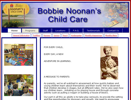 Boobie Noonan's Child Care site uses a horizontal dropdown menu. This allowed us to have less links in the main menu so the navigation was cleaner looking. Each page has different images in the left column to match the content. The contact page makes use of a form allowing Bobbie Noonan's to receive detailed information from anyone requiring about them.